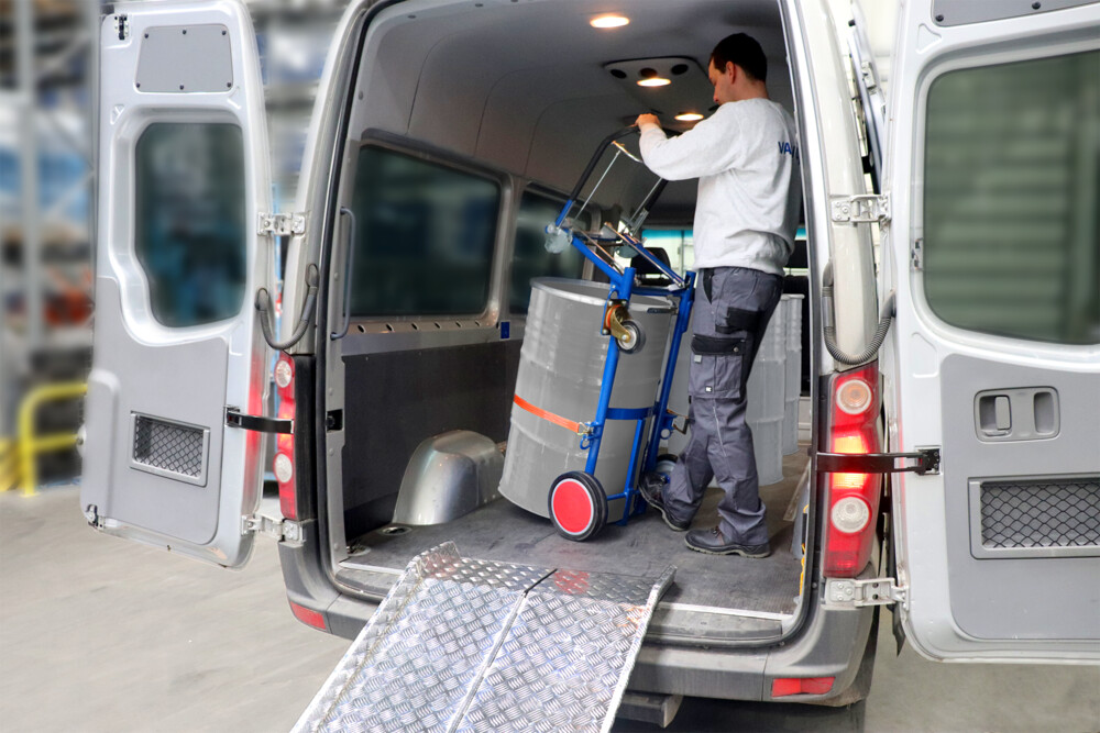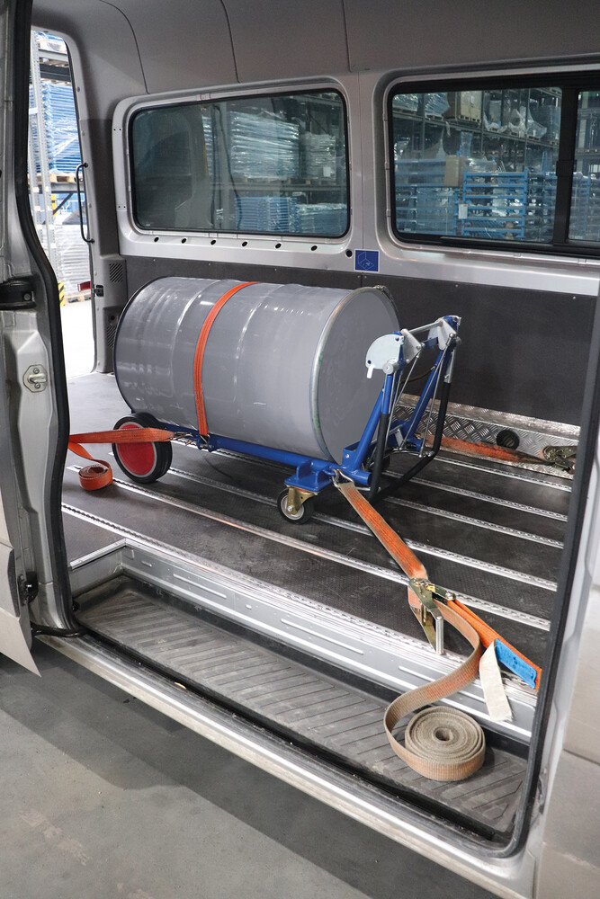 Incl. 4 welded-on safety eyelets for fixing the drum trolley using tension belts