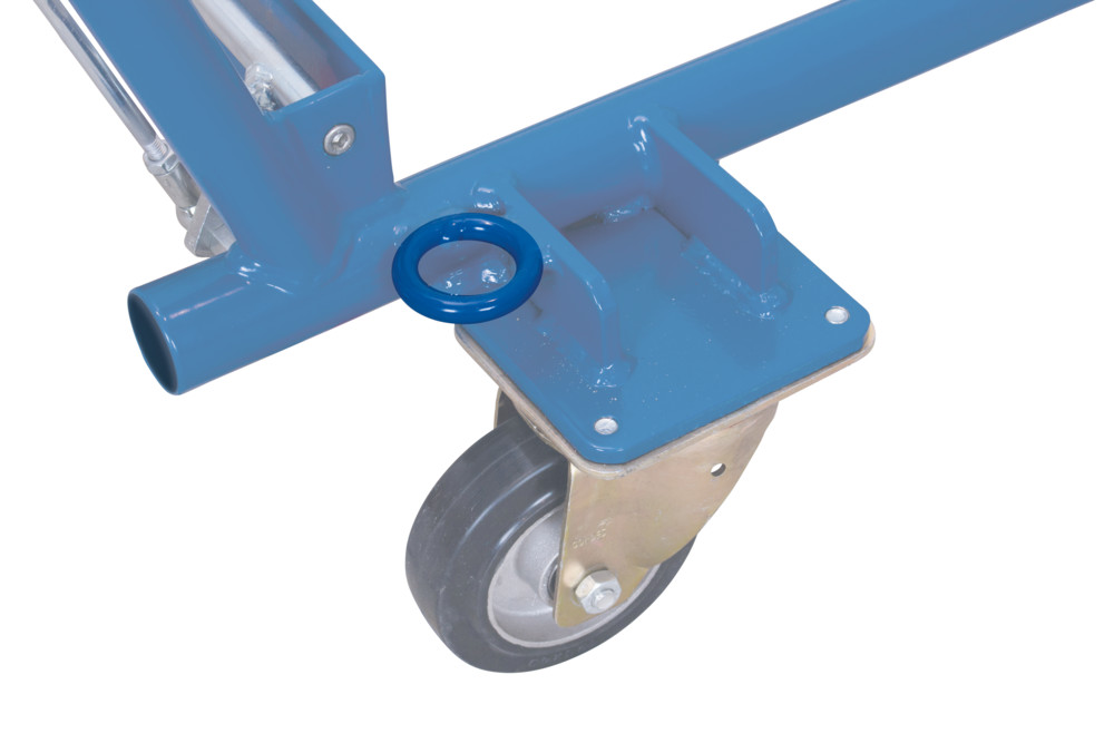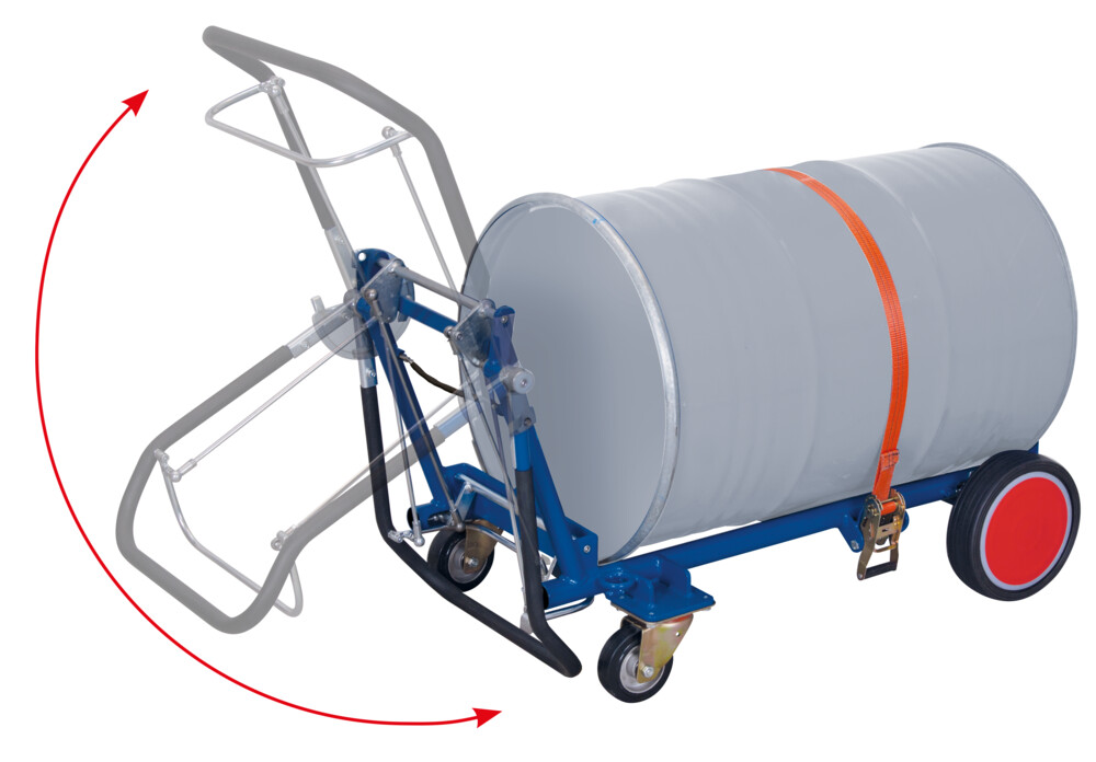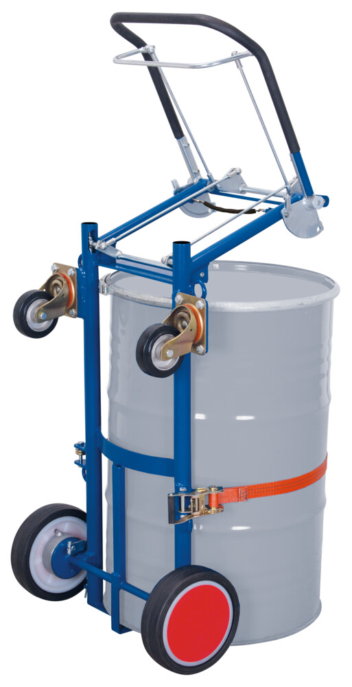 Welded steel construction For moving, storing and emptying 200 l steel drums Lever with plastic safety handle With 4 plastic wheels Permanent surface protection Impact- and scratch-resistant Polyamide tyres on roller bearing, 2 swivel castors with brakes and 2 polyamide wheels on one axle.