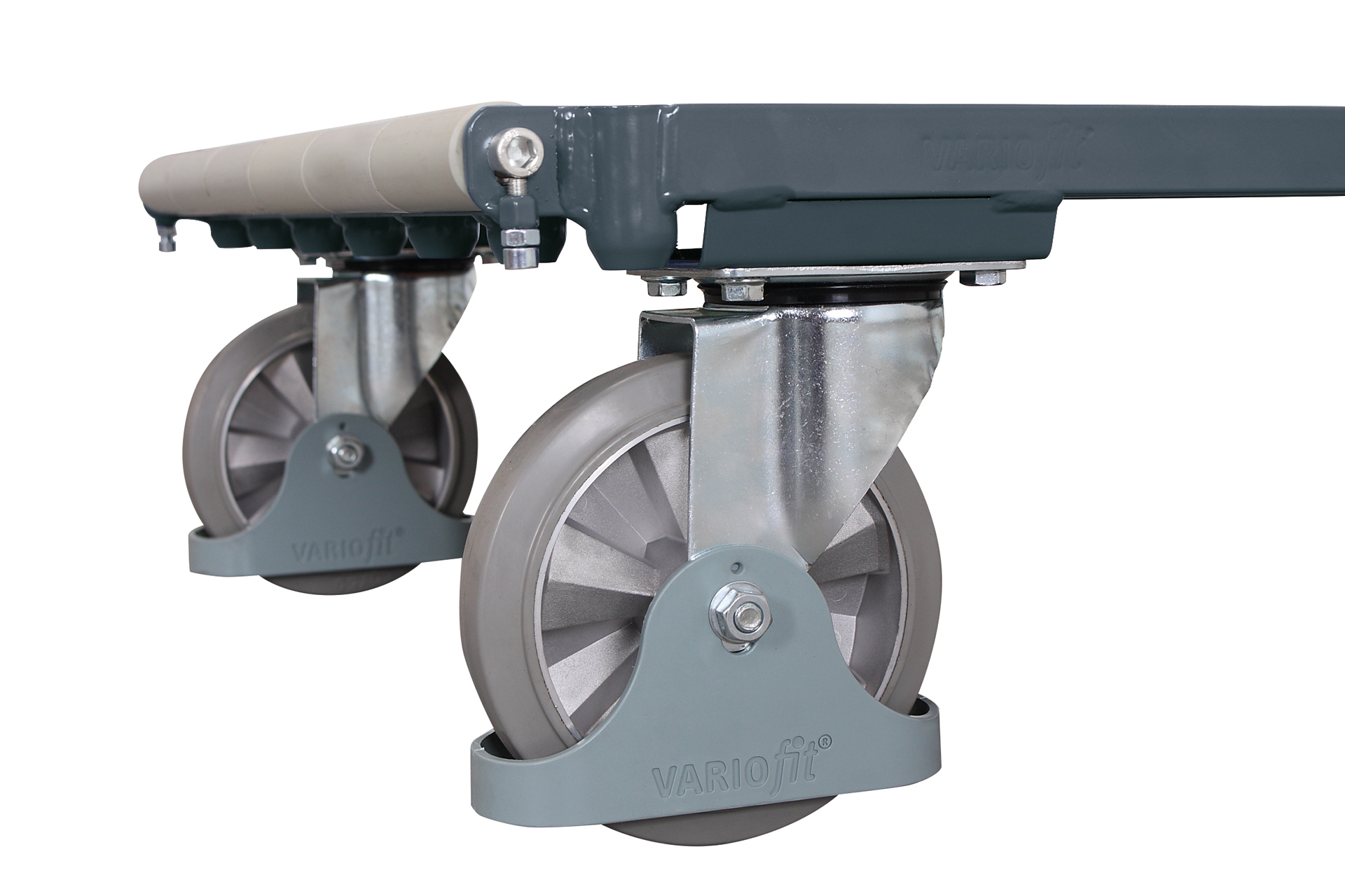 roues à bandage en caoutchouc élastique plein avec jante en aluminium et roulement à billes de précision, gris, 2 roulettes pivotantes avec frein EasySTOP et 2 roulettes fixes (1 roulette pivotante et 1 roulette fixe sont bloquées sur le côté long).