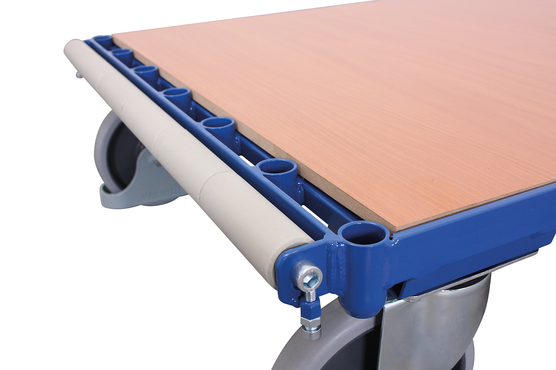 Spawana konstrukcja stalowa ze skośną powierzchnią użytkową z blachy stalowej nachylenie 22° do transportu drewnianych płyt i płyt z tworzyw sztucznych o dużej powierzchni z przestawnym zabezpieczeniem, max. pryzma płyt 200 x 1.500 mm (głębokość/wysokość) wysoka odporność na uszkodzenia mechaniczne koła pneumatyczne, felga stalowa lub z pełnej gumy, felga specjalna plastikowa z precyzyjnym łożyskiem kulkowym i kołpakiem z tworzywa dodatkowo 2 koła podporowe.
